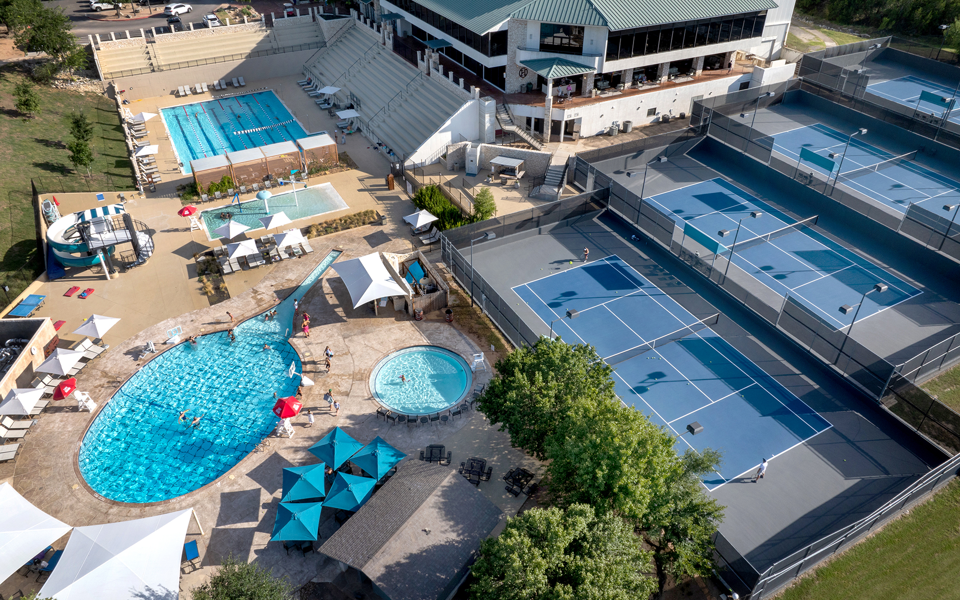 We offer 13 outdoor tennis courts, 2 indoor tennis courts, and 9 pickleball courts, with access to competitive leagues like USTA and daily mixers.